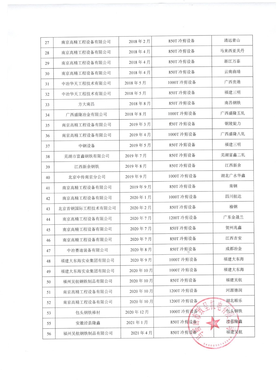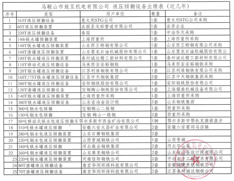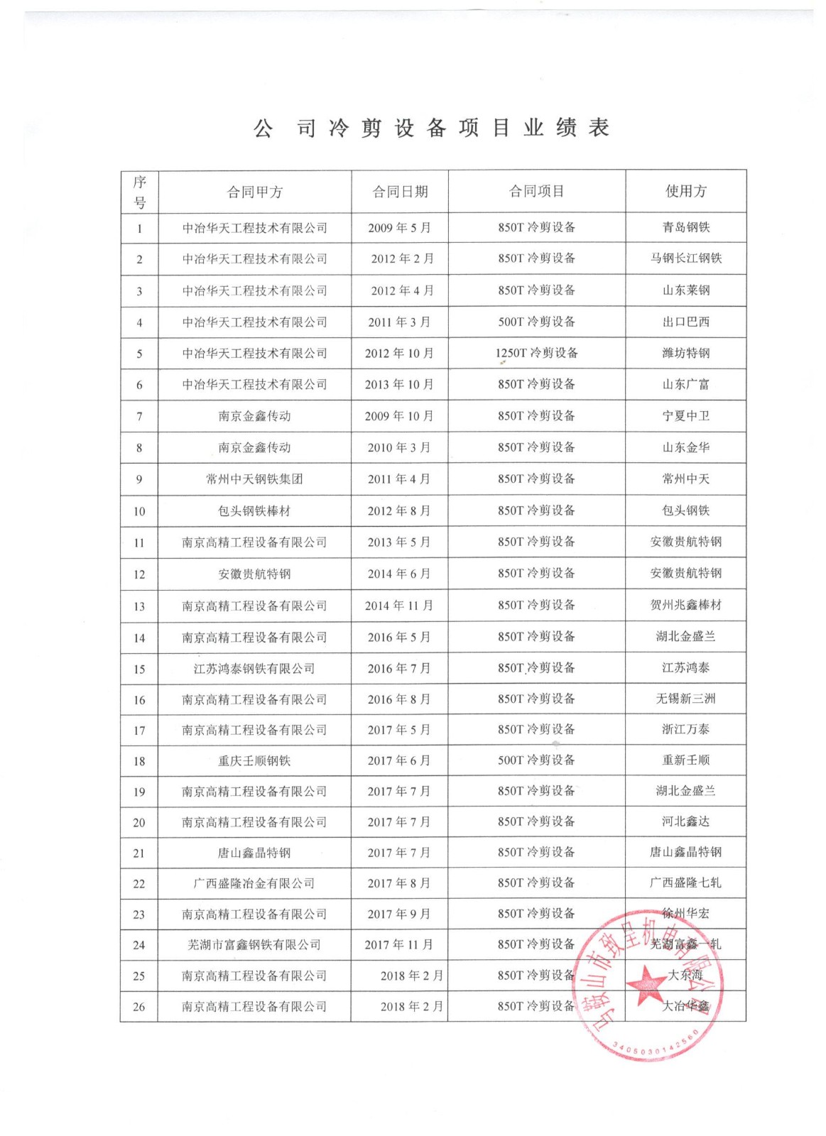 公司近幾年冷剪設備業(yè)績(jì)表